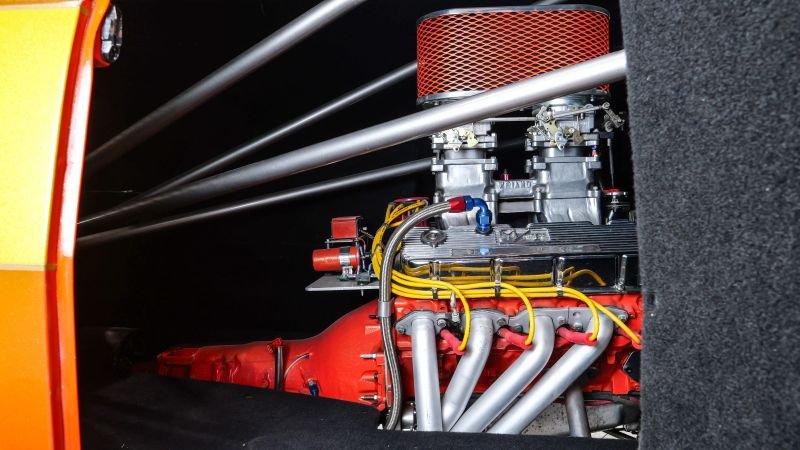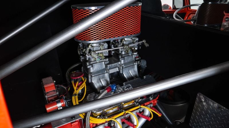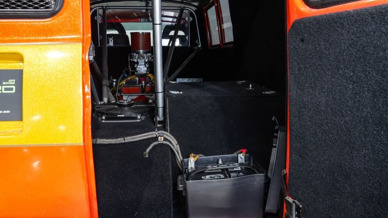 Cooling is handled by a custom aluminum radiator and rear-mounted cooling fan , while the drivetrain and chassis have been meticulously engineered to handle the incredible power output— over 750 horsepower . Supporting components include wheelie bars and a functional rear parachute , adding both capability and attitude to this wild street machine.
