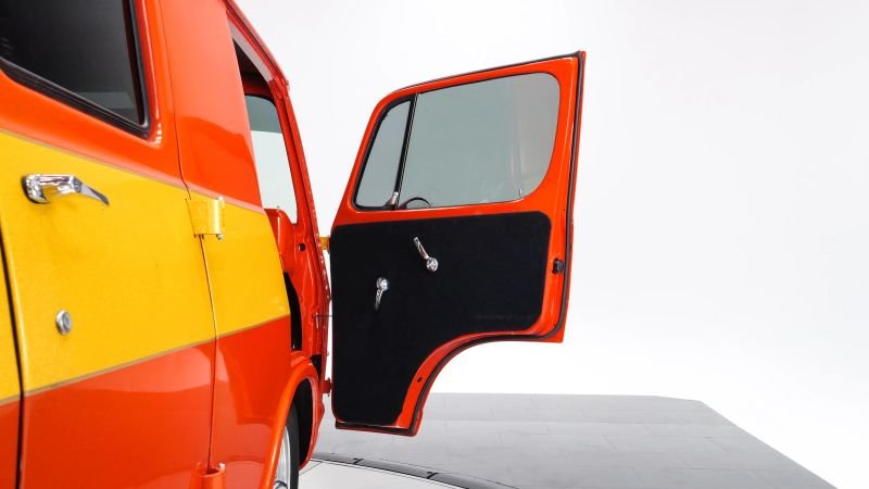 Finished in an eye-catching two-tone metallic paint job loaded with heavy flake , the van shines brilliantly under any light and perfectly captures that 1970s custom-van nostalgia blended with modern pro-street aggression.